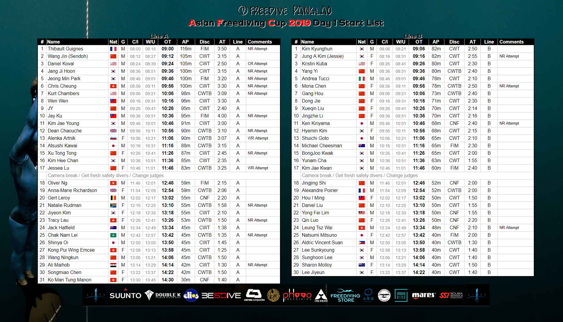 2019, Uncategorized Start list for the first day of Asian Freediving Cup 2019 Posted by Asian Freediving Cup on June 8, 2019November 24, 2020 There are some big dives coming up, including two world record attempts, at least one continental record attempt, and 16 national record attempts. Here is the start list, good luck to all athletes! Start list of Day one of Asian Freediving Cup 2019 Share this: Click to share on X (Opens in new window) X Click to share on Facebook (Opens in new window) Facebook Like Loading...