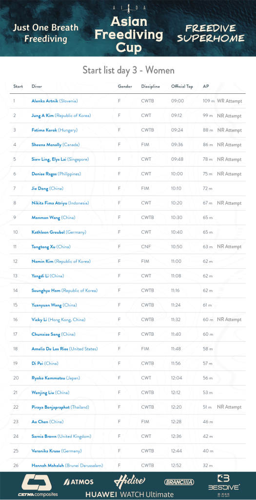 2023, Uncategorized Start list for day three of AIDA Asian Freediving Cup 2023 Posted by Asian Freediving Cup on June 11, 2023June 12, 2023 We’re excited to see lots of record attempts for day three. Hoping for more great dives! Photo: Ben Sponsors of AIDA Asian Freediving cup 2023: CETMA Composites BESTDIVE HIDIVE (China) Huawei WATCH Ultimate ATMOS BRANCIIIA Share this: Click to share on X (Opens in new window) X Click to share on Facebook (Opens in new window) Facebook Like Loading...