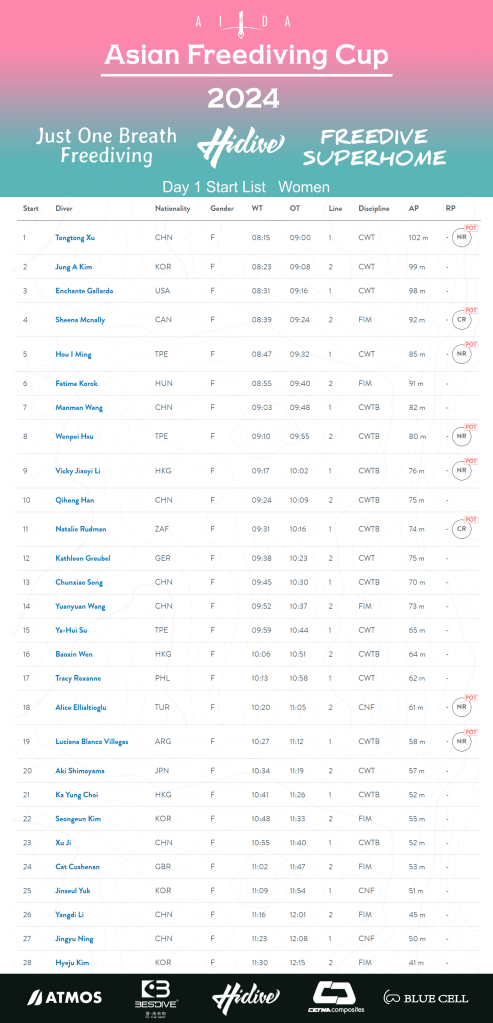 Here’s the start list for the first day of AIDA Asian Freediving Cup 2024. We’re looking forward to see many beautiful dives and strong performances!