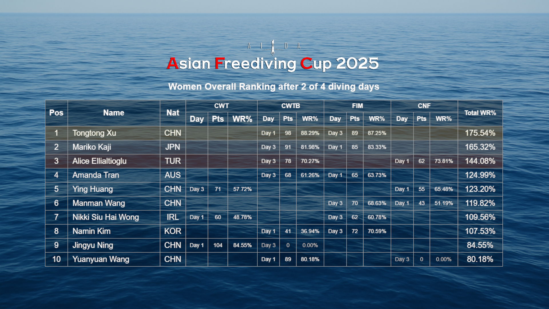 Favorites Tongtong Xu, Mariko Kaji, and Alice Ellialtioglu have all delivered strong performances in two disciplines. Tongtong leads with 176 points, Mariko is second at 165, and Alice follows with 144 points. Tongtong has produced the highest- and third-highest-scoring dives of the competition so far (behind Hua Yang Huang’s 120 m CWT).