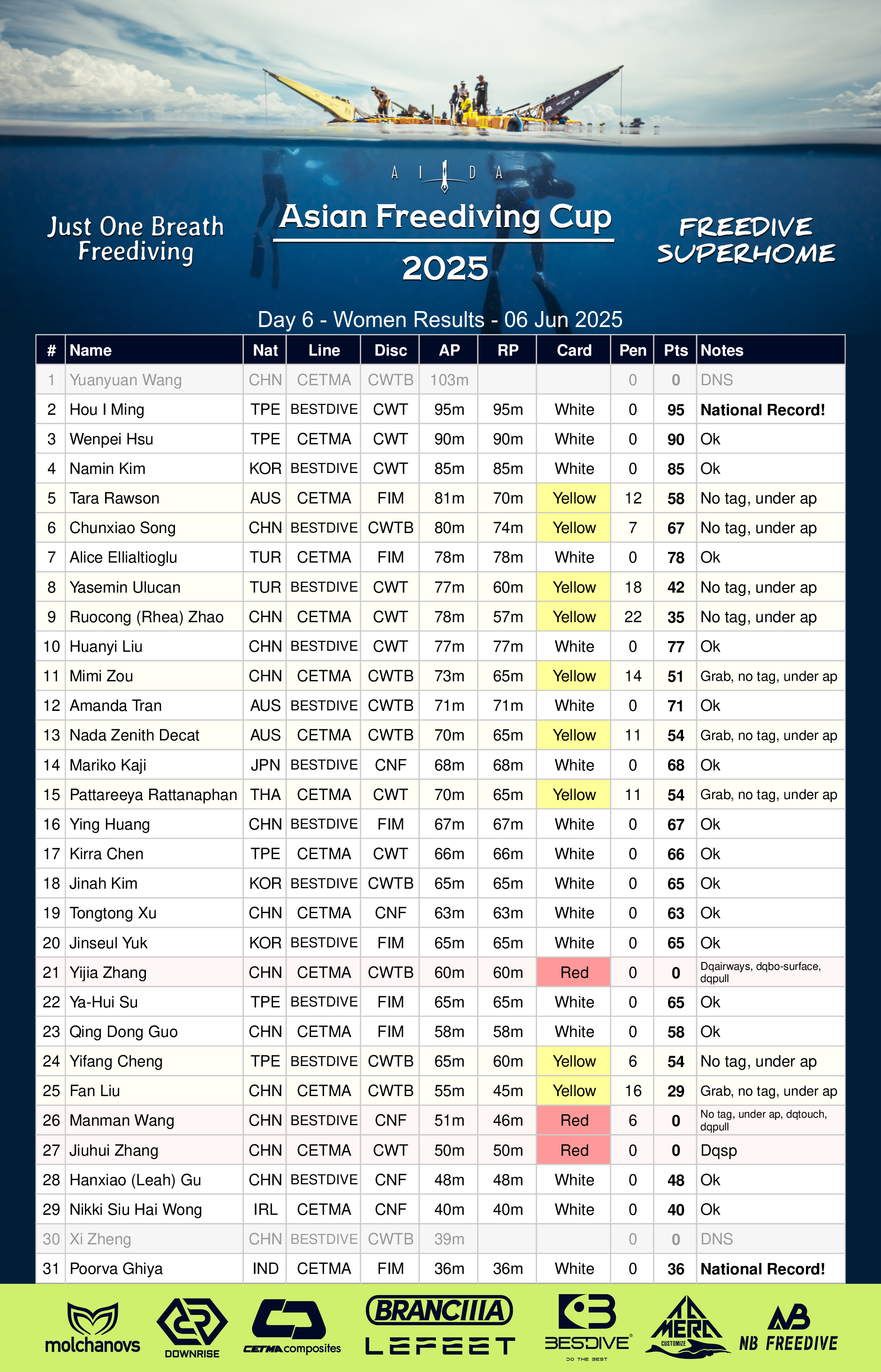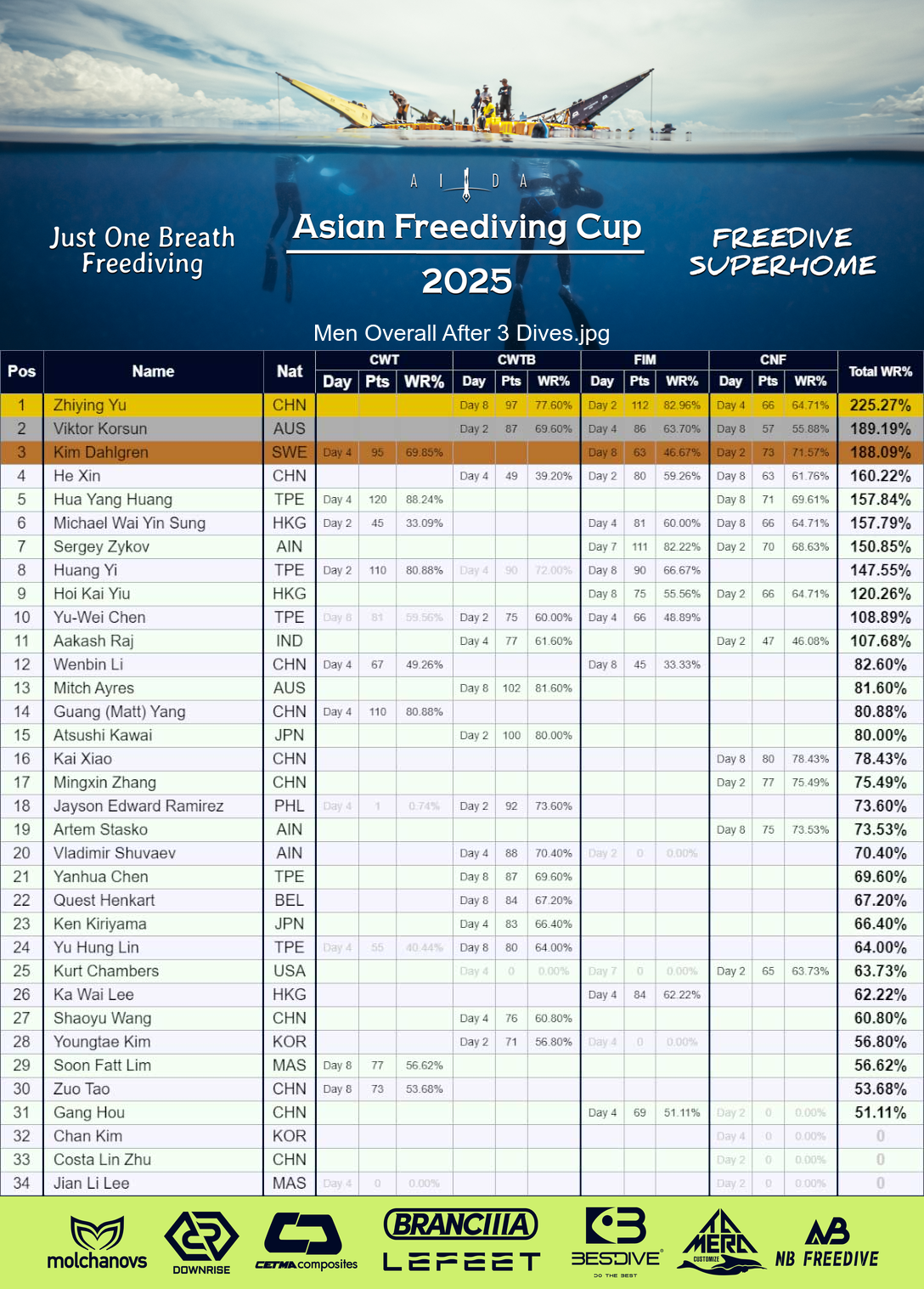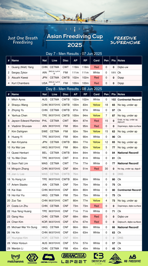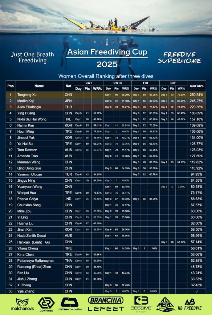 In the overall ranking Xu Tongtong took a big step towards winning AIDA Asian Freediving Cup 2025. After the third dive Mariko Kaji is the only one that could practically catch up, but she’s a bit more than 4 WR%-points behind. It would require a massive dive on the last day for Mariko to make the jump to the top of the podium.